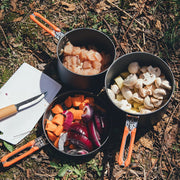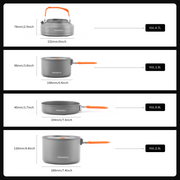 The pots and frypan feature with foldable locking handle design and all items are designed to fit within one another to store and carry securely within your backpack or camping bag. Only weighs 1014g, it's small enough for backpacking and ideal for groups of 3-4 people.