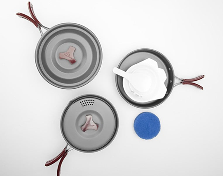 Lightweight aluminum pot and pan set Designed for groups of 2-3 people, can be packed as a set. Doesn't take up space in the bag.