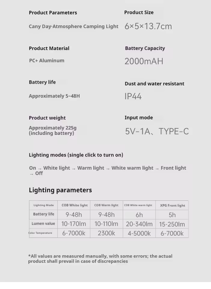 Brand: Naturehike-BLACKDOG Model NO. : CBD2550ZM014 Product size: 6x5x13.7cm Product Material: PC+Aluminum Battery life: Approximately 5-48H Product weight: about 225g(including battery) Battery Capacity: 2000mAH Dust and water resistant: IP44 Input mode: 5V-1A、TYPE-C
